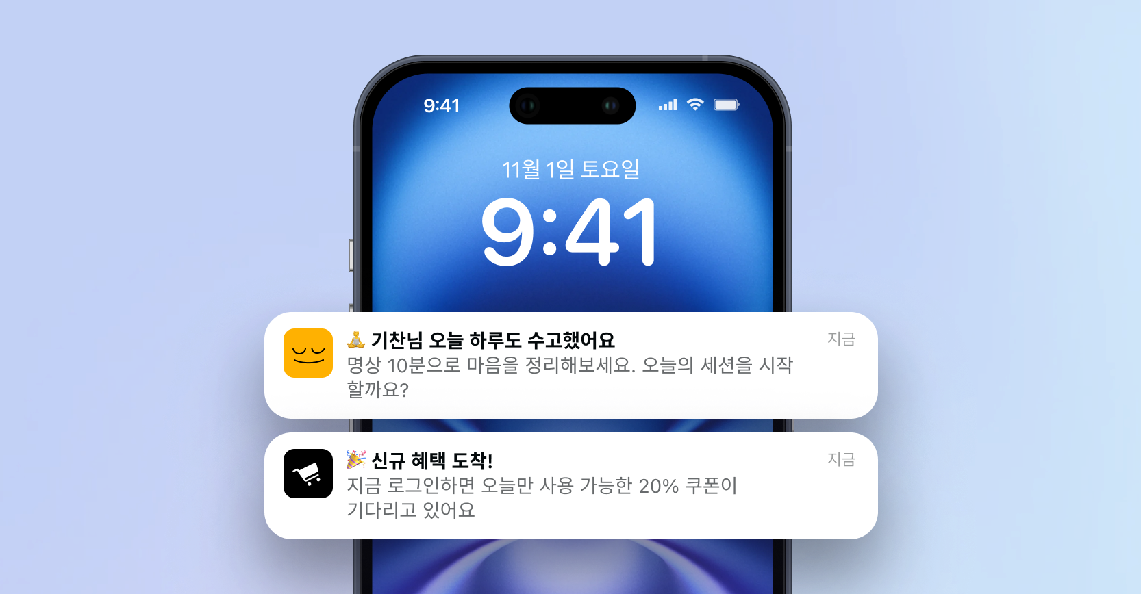 앱·웹 푸시를 무료로 발송할 수 있고, 특정 화면으로 바로 이동하는 딥링크도 지원합니다.