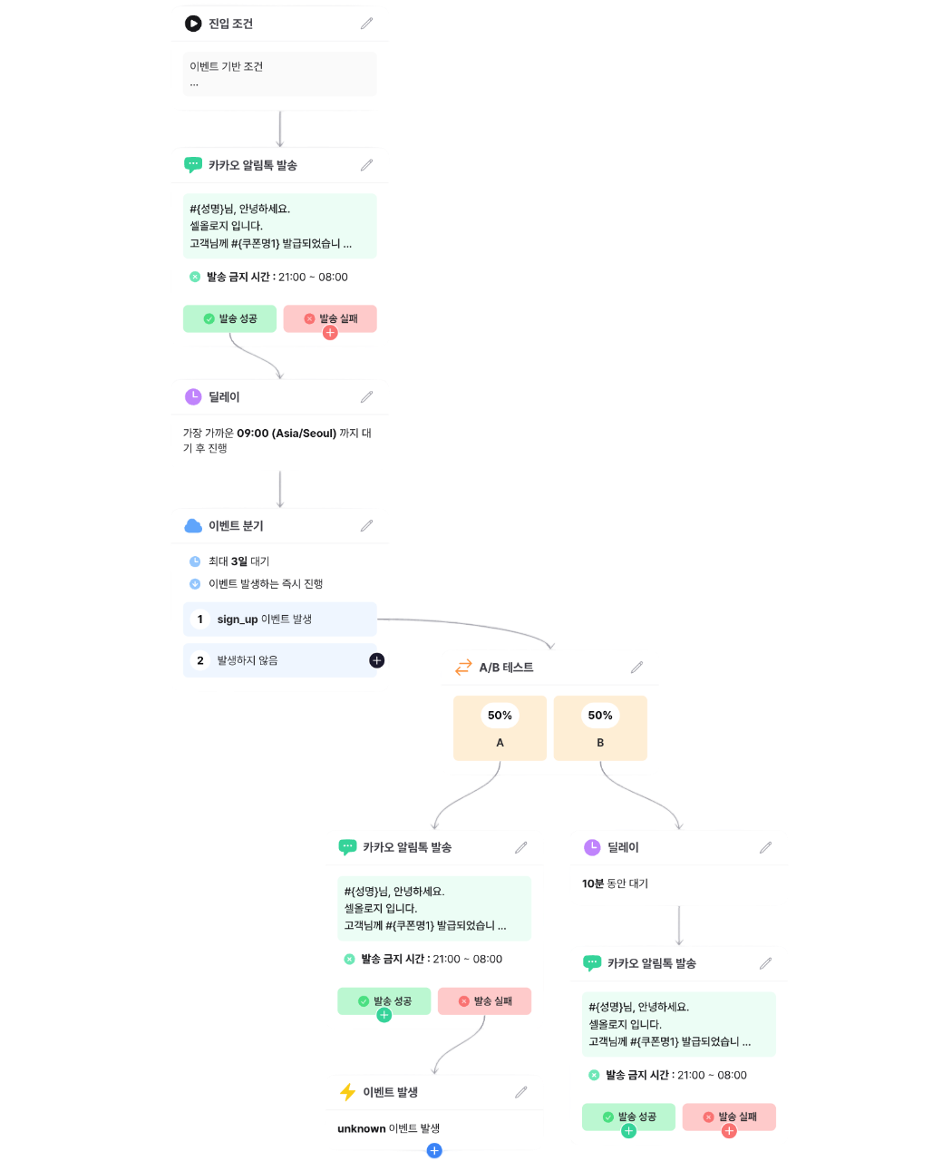 - 다양한 조건 분기를 연결하여 복잡한 조건의 발송 대상에게도 정확한 시점에 메시지 전달 가능