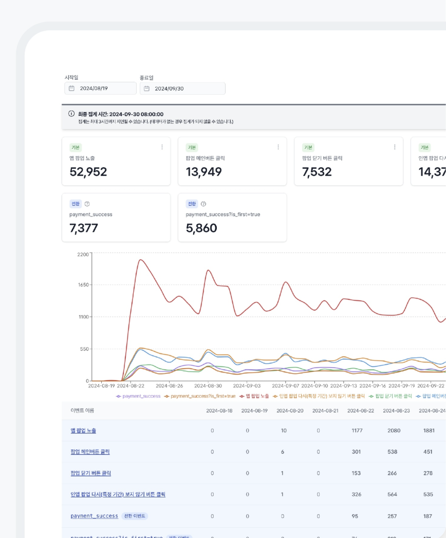 - 유저 여정으로 설계된 각 퍼널의 전환율 / 도달율 분석 제공